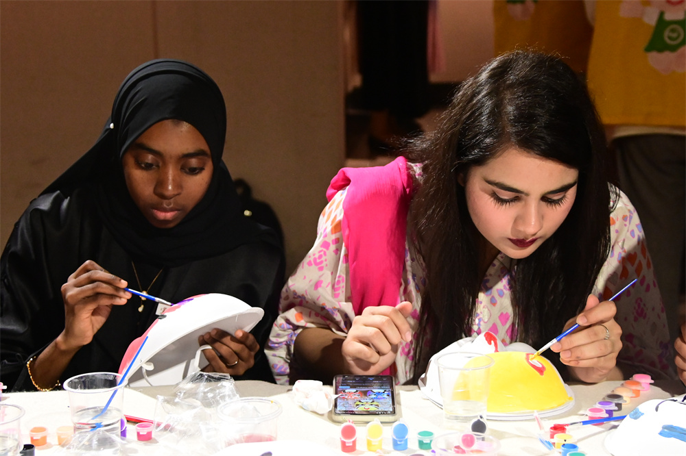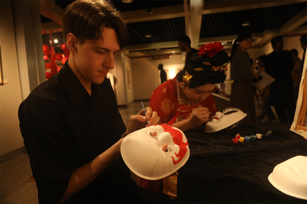 在脸谱体验区,朱砂、石青、藤黄在素胚脸谱上洇出晚霞般的层次。坦桑尼亚留学生宜悦宁托举着未完成的关羽脸谱,指尖抚过凸起的卧蚕眉,望着脸谱上的金线,神情专注。