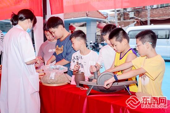 在传统手工艺体验方面,金浦、田中、双塔等社区“党建+”邻里中心开展剪纸、刻纸活动,非遗传承人现场讲解并指导居民以红纸为媒、刻刀为笔,创作龙纹、吉祥图案等作品,亲身体验千年刻纸艺术的精妙。东门、幸福等社区“党建+”邻里中心推出珠绣和烧箔画沙龙,传承人带领居民穿针引线、以箔为墨,在工艺实践中传递非遗美学与文化内涵。清正、笋浯等社区“党建+”邻里中心则开展陶艺拉坯与纸织画体验,参与者通过揉泥塑形、经纬交织,感受德化陶瓷与永春纸织画的制作技艺和工匠精神。在民俗与表演艺术活动中,霞洲社区“党建+”邻里中心依托刣狮传习所举办“小小传承人”体验,让孩子亲身体验闽南舞狮与少林五祖拳,领悟非遗与武术融合的魅力。延陵社区“党建+”邻里中心推出古法造纸、京剧花旦包头及簪花制作系列活动,将传统技艺与审美教育相结合。金峰、促进、东鲁等社区“党建+”邻里中心开展妆糕人制作,非遗老师带领孩子们揉捏塑造,生动传承民间塑形艺术。龙岭社区“党建+”邻里中心以布袋戏《月亮逃跑记》演绎结合闽南童谣,让非遗在故事与笑声中浸润童心。在互动实践与科学教育板块,新峰社区“党建+”邻里中心聚焦“水密隔舱福船技艺”,通过模型制作与漏水测试,让孩子们在协作中理解古代航海智慧;仙塘社区“党建+”邻里中心组织闽南瑞兽文化研学,让孩子们亲手制作瑞兽手作,认识本土文化符号;东鲁、笋浯等社区“党建+”邻里中心开展糖画DIY,从熬糖到浇铸,让孩子们完整体验糖画制作的非遗技艺。